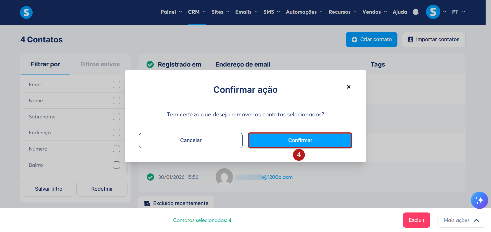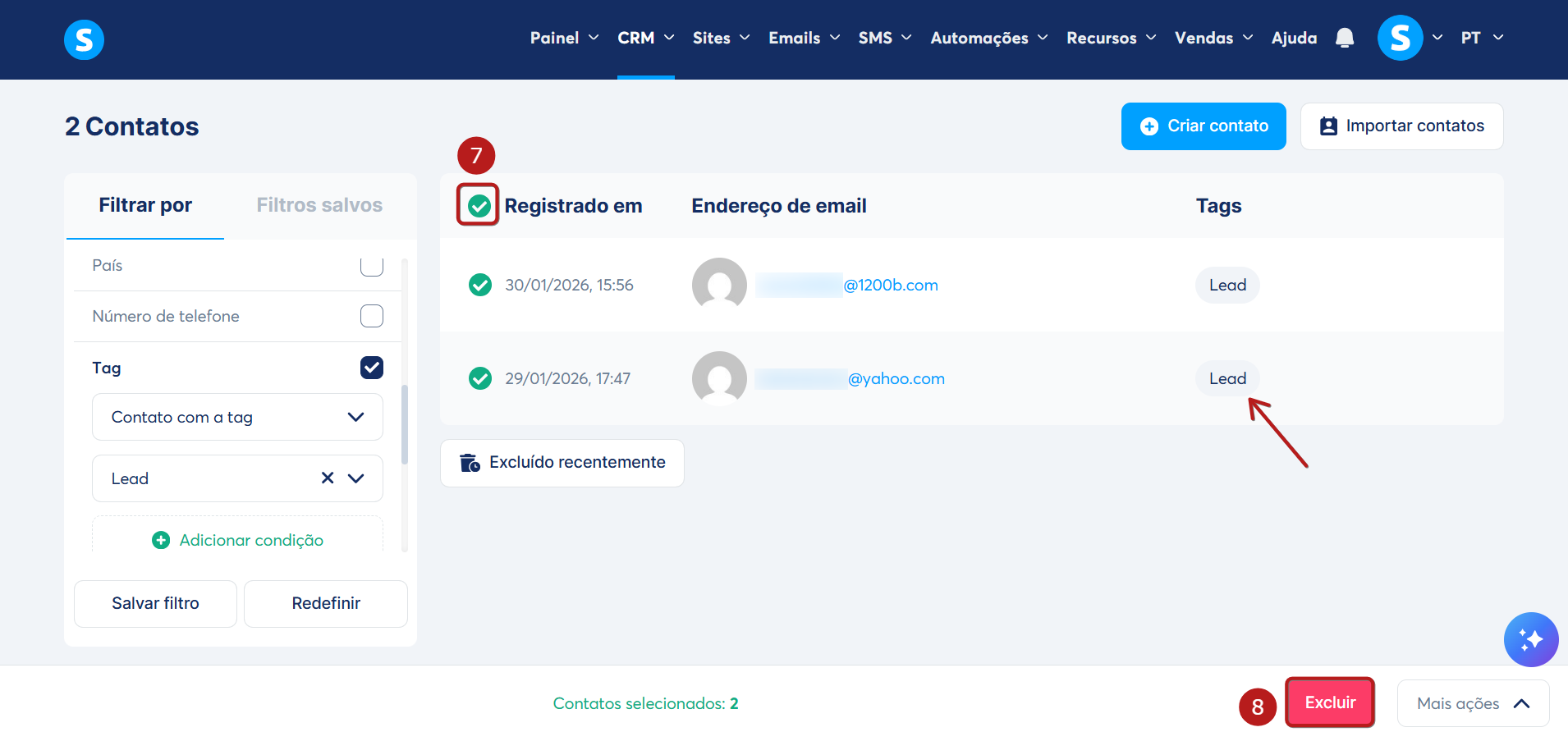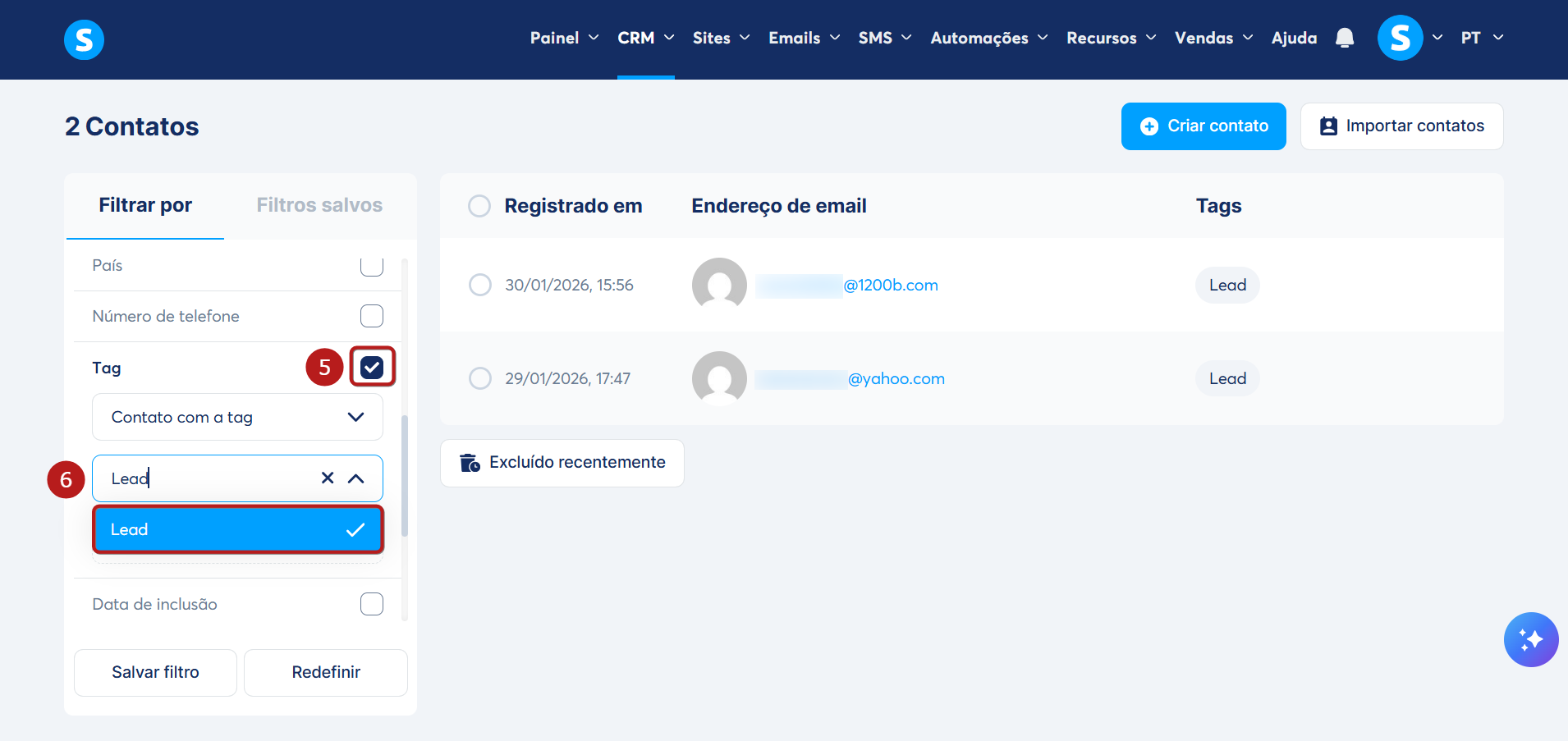 Por exemplo, se você deseja excluir todos os contatos com a tag Lead, selecione o filtro Tag (5) e, em seguida, selecione Lead na lista de tags (6).