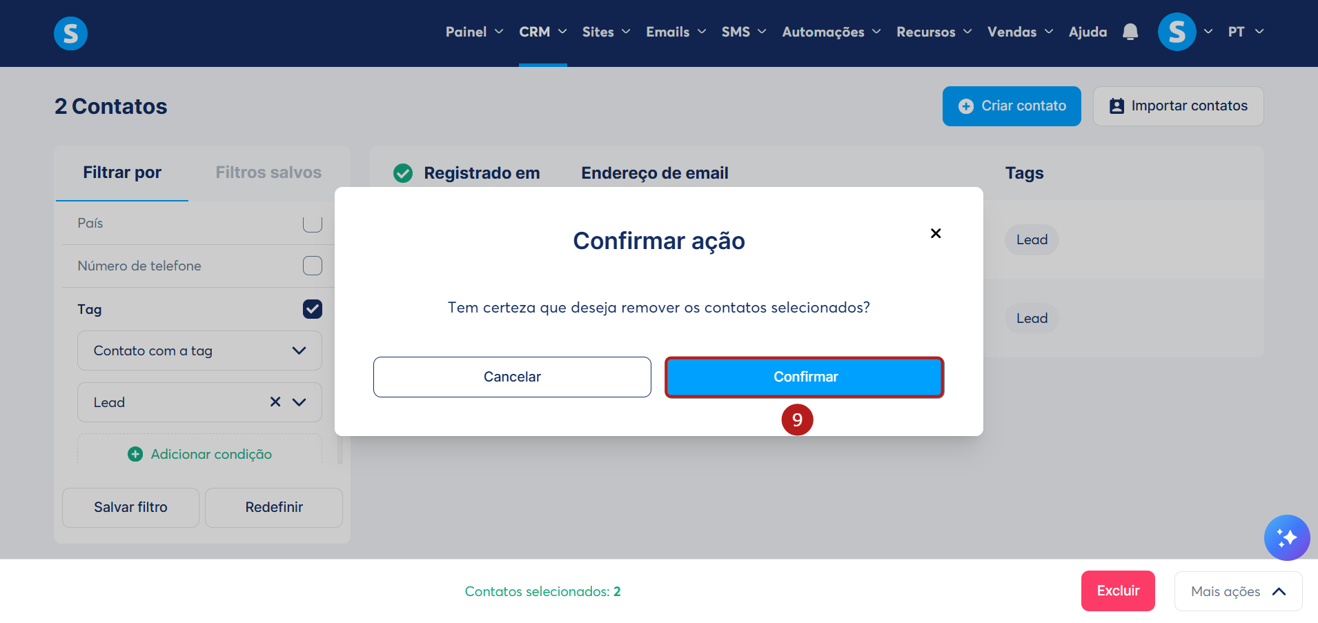 Clique em Confirmar para excluir os contatos selecionados (9).