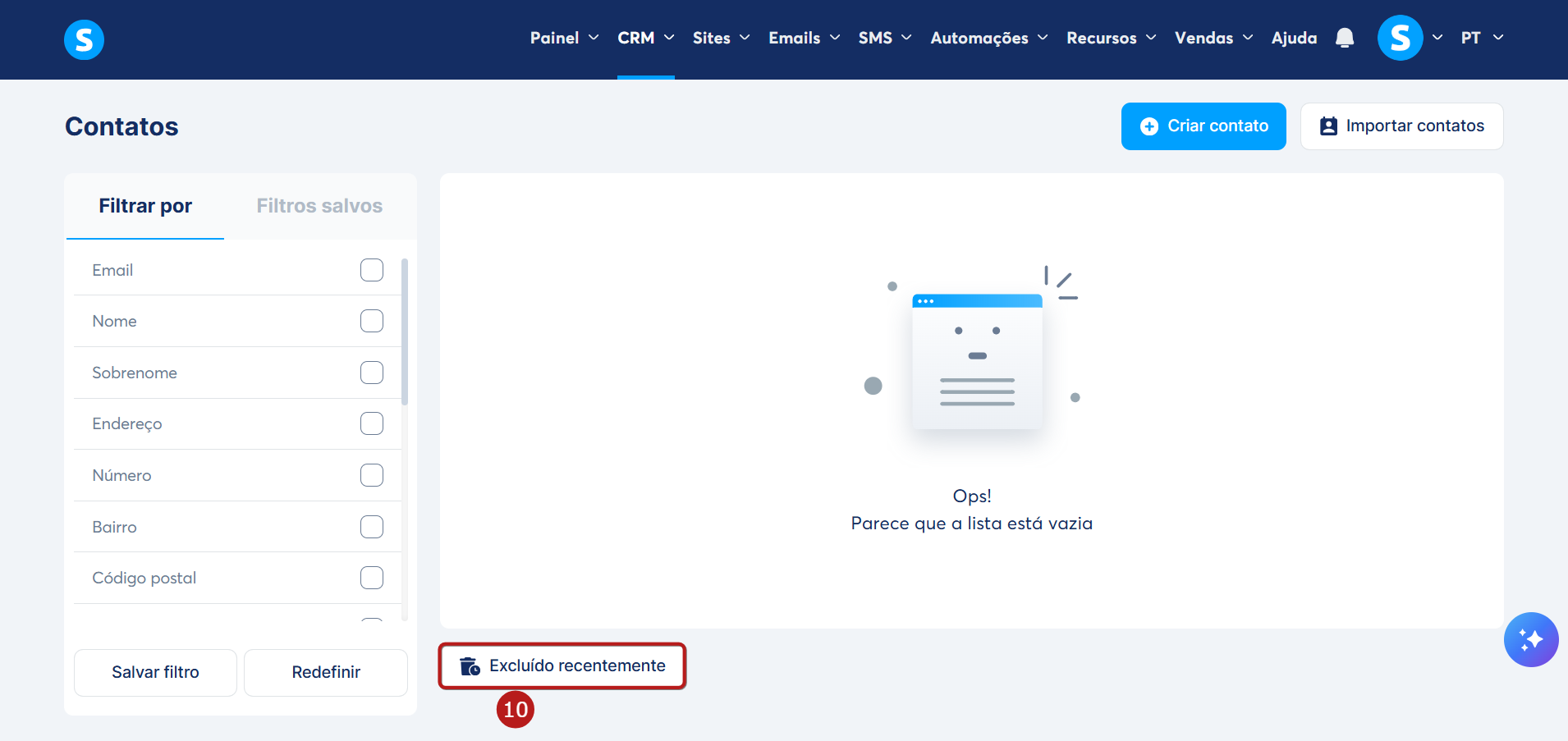 Para restaurar um contato excluído, clique em Excluído recentemente (10) em sua página de contatos.