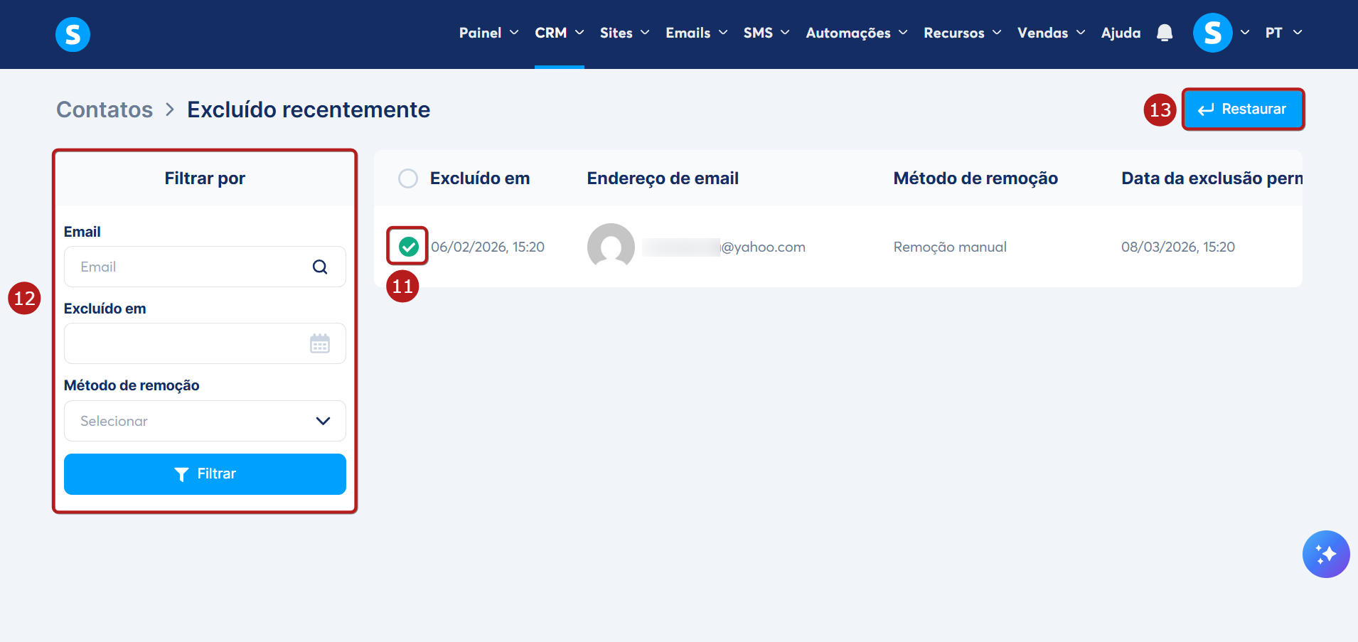Você pode selecionar manualmente os contatos que deseja restaurar (11) ou usar os filtros à esquerda para encontrá-los facilmente (12). Em seguida, clique em Restaurar (13).