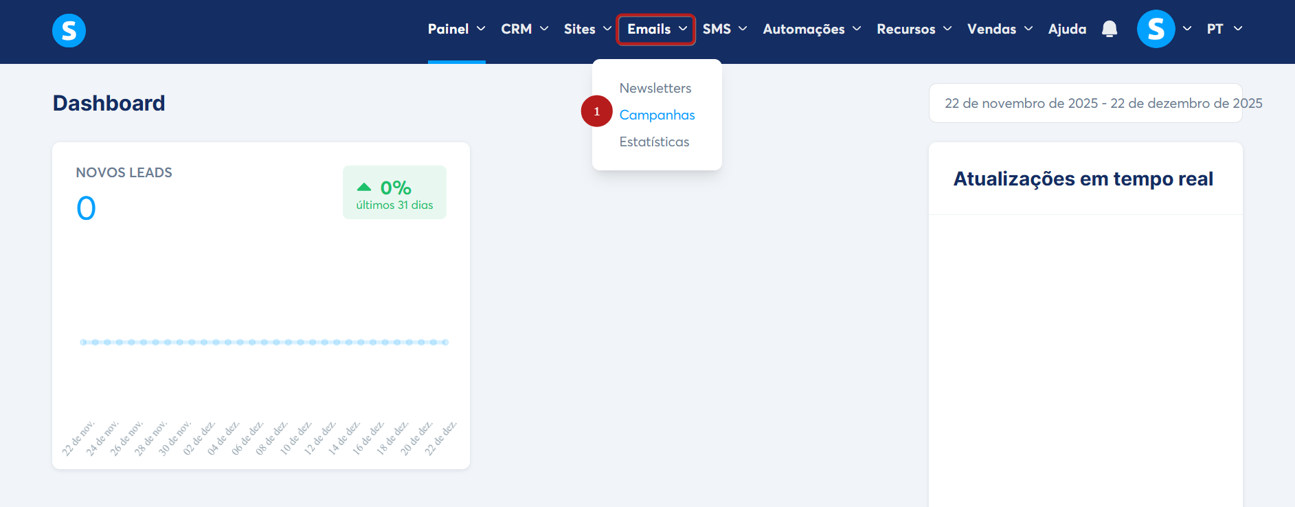 Para criar uma campanha, vá até a aba Emails e selecione Campanhas (1).