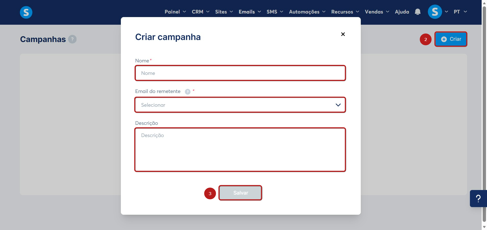 Clique em Criar (2) e, no pop-up que será exibido, insira um nome para a campanha, selecione o email do remetente e acrescente a descrição da campanha.