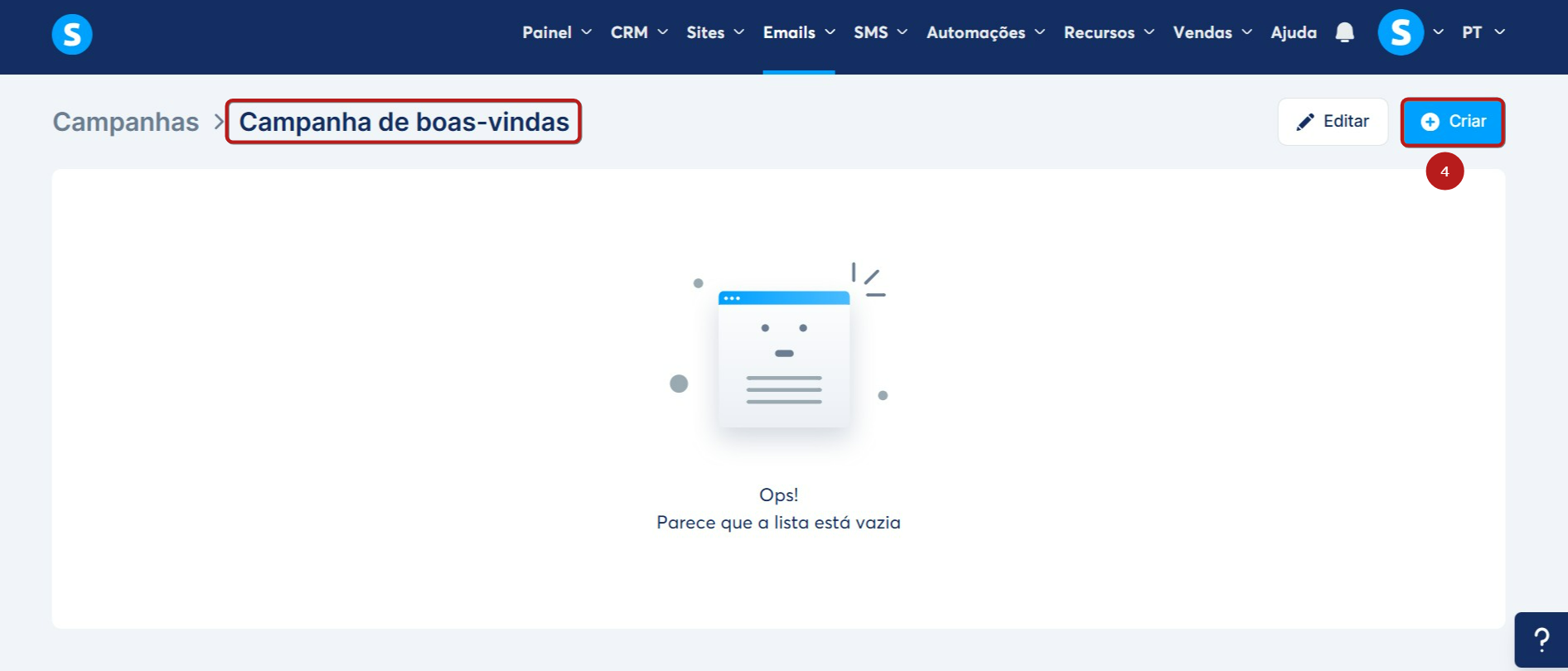 Primeiro, acesse sua campanha clicando sobre o nome e, em seguida, clique em Criar para criar o primeiro email de sua campanha (4).