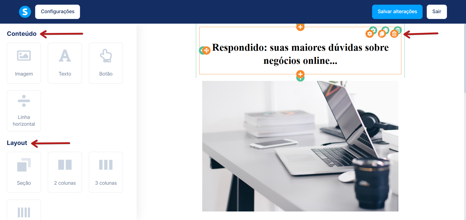 Assim como no editor de páginas, clicar em qualquer elemento permitirá que você configure suas opções.