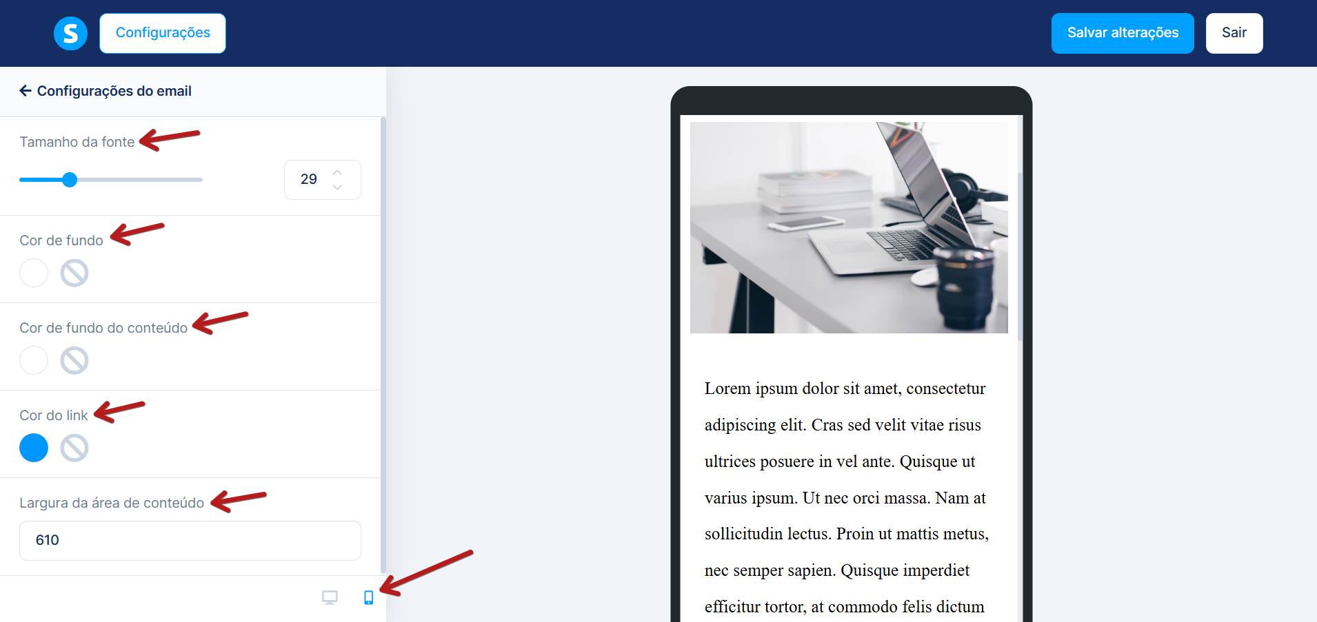 Após concluir o conteúdo do email, clique em Salvar alterações e depois em Sair, para ir para a próxima etapa.