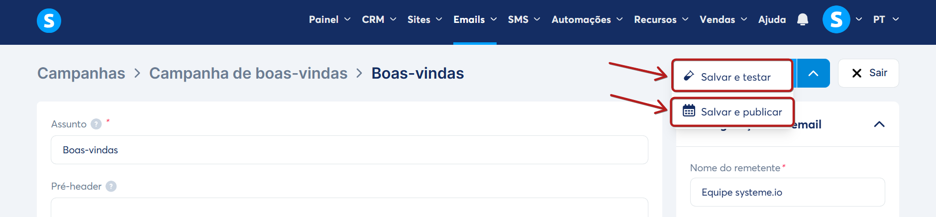 - Salvar e testar: para salvar sua campanha de emails e receber um email de teste