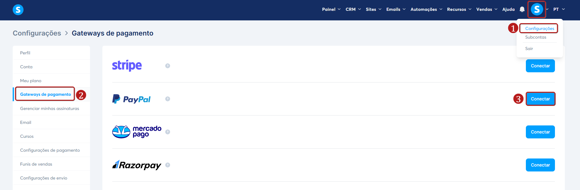 No painel de configurações à esquerda, clique em Gateways de pagamento (2) e depois em Conectar para a opção do PayPal (3).