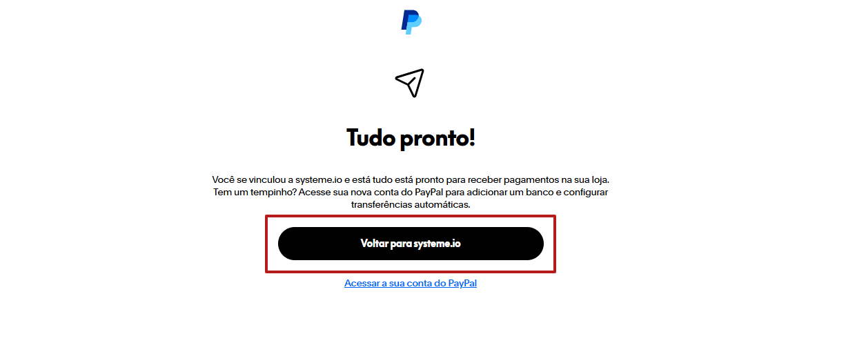 Depois de conceder a permissão, o PayPal confirmará que a conexão está pronta. Clique em Voltar para systeme.io para retornar à sua conta da systeme.io.