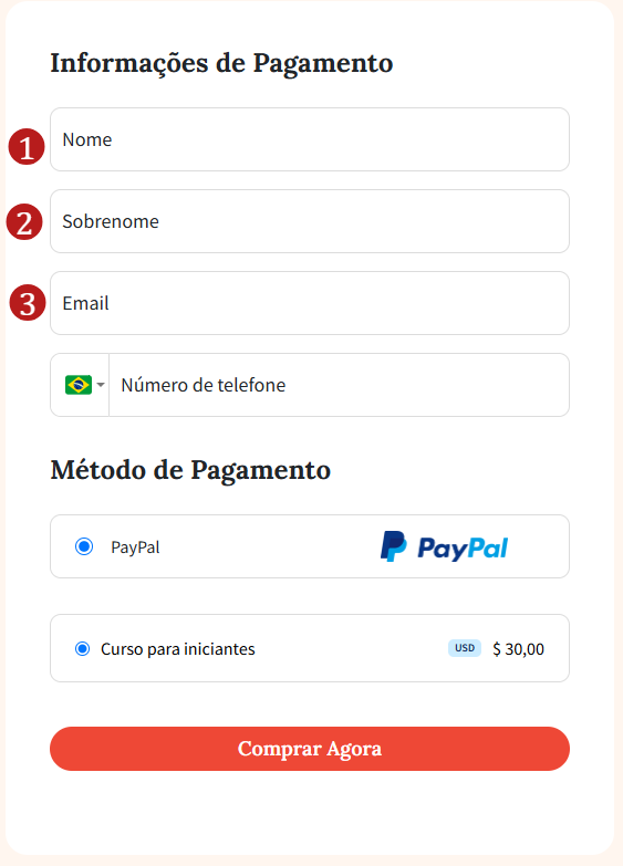 Observação: para processar pagamentos pelo PayPal, você deve adicionar os campos email (1), nome (2) e sobrenome em todos os formulários das páginas de pagamento.