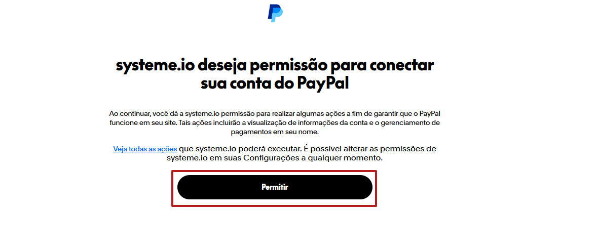 Após o login, o PayPal exibirá uma tela de permissão solicitando que você autorize a systeme.io a se conectar à sua conta. Clique no botão Permitir para conceder a permissão.