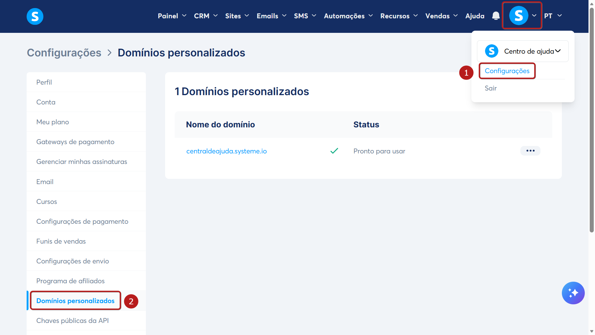 1.1. Acesse o menu em sua foto de perfil, clique em Configurações (1) e depois em Domínios personalizados (2).