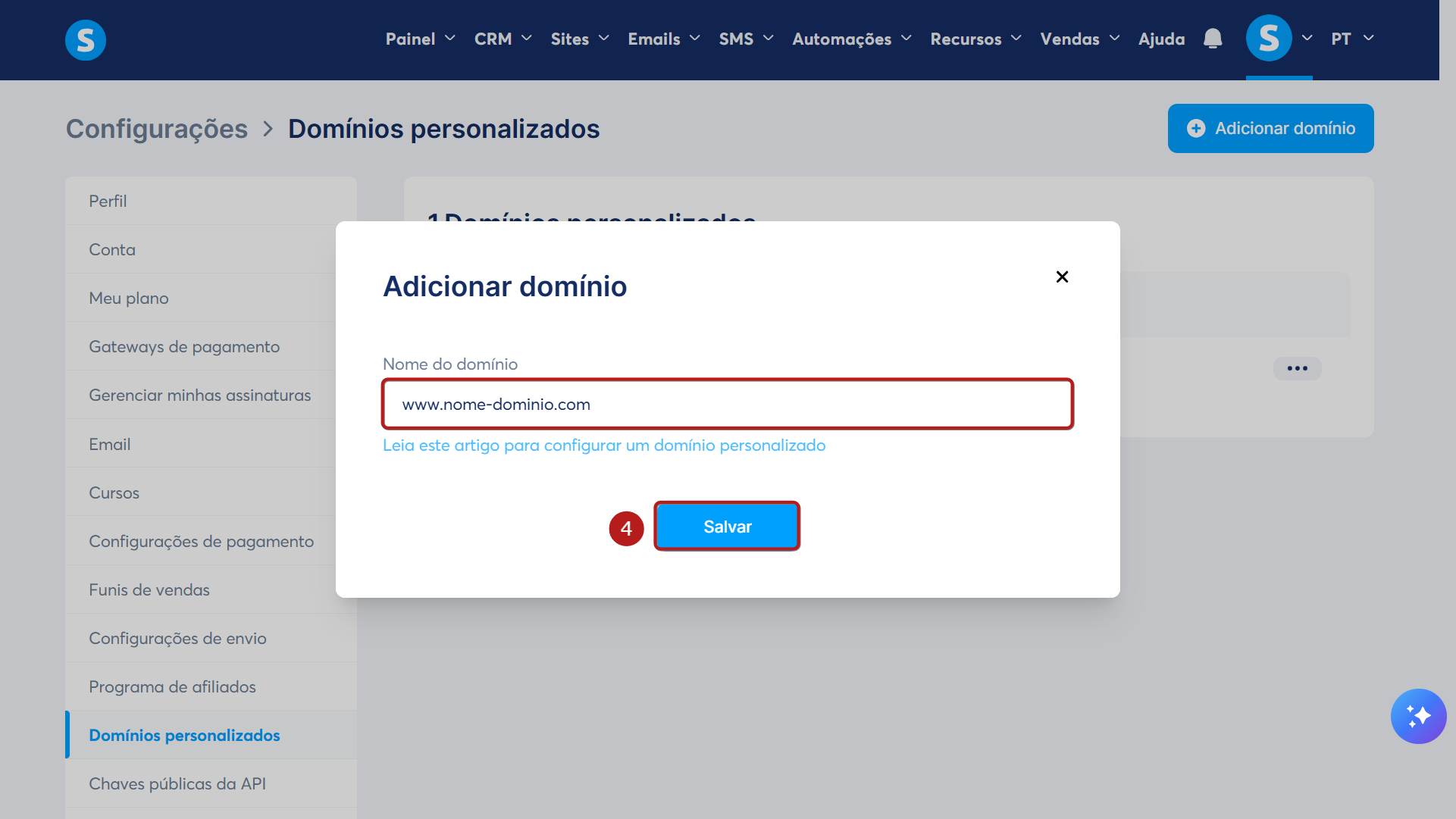 1.2 No pop-up que será exibido, insira o nome do seu domínio com www (www.dominio.com) e clique em Salvar (4).
