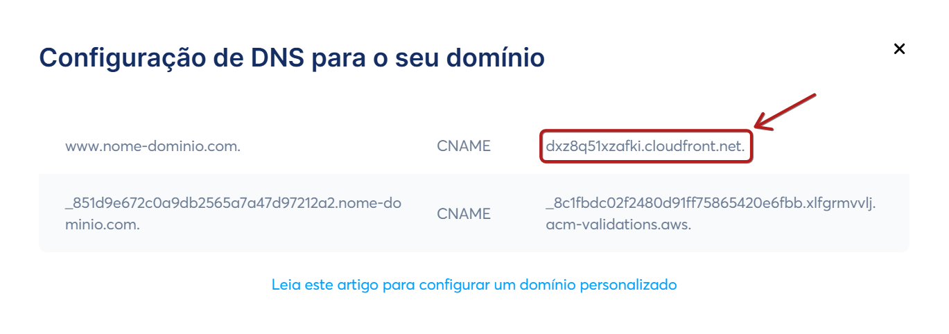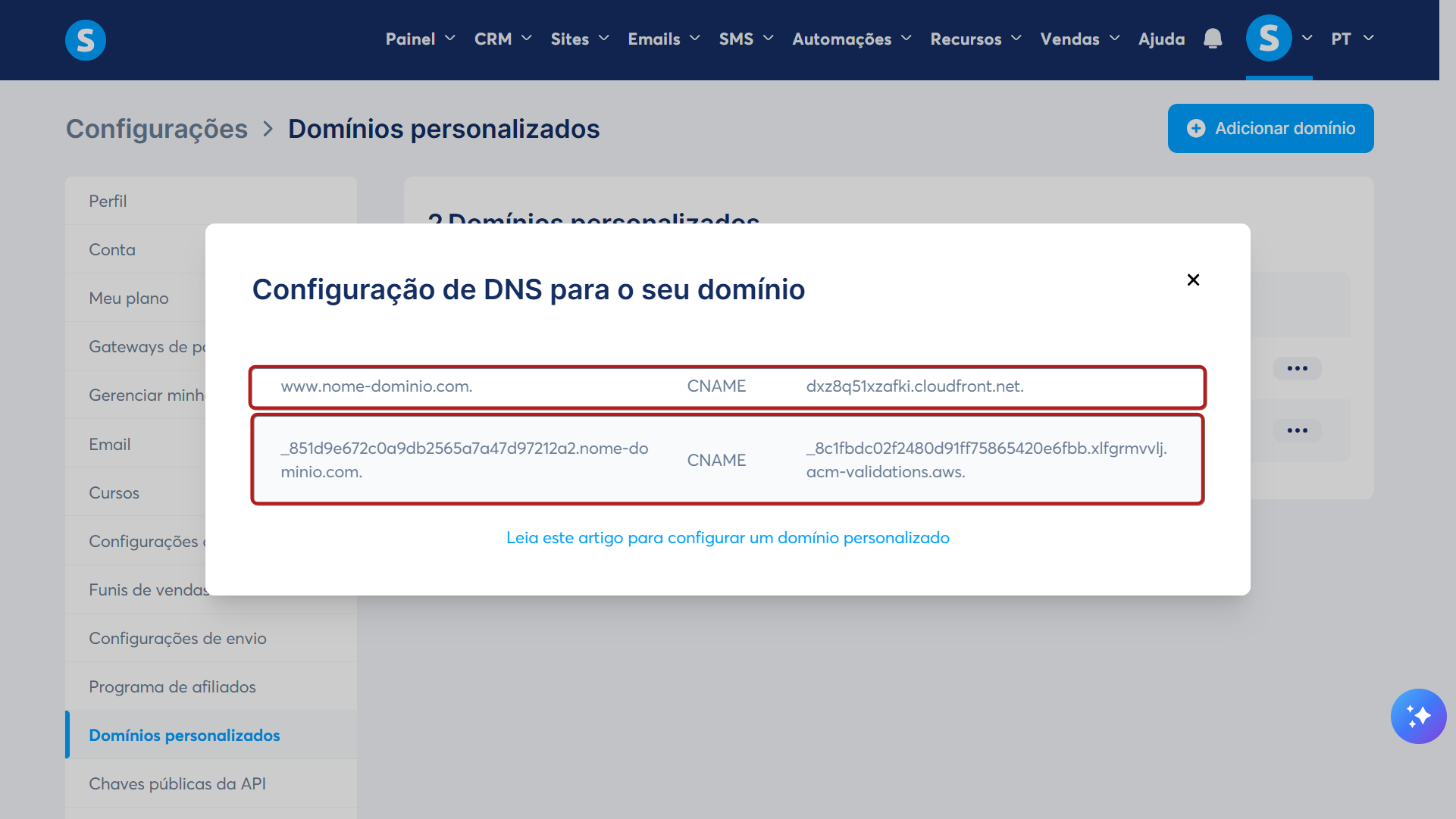 1.3. Depois que o domínio for adicionado e salvo, uma nova janela pop-up exibirá dois registros CNAME. Você deve adicioná-los às configurações de DNS do seu host para conectar seu domínio.