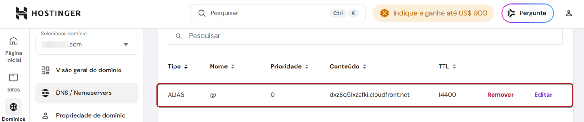 Se você usa o provedor de hospedagem Hostinger, você precisa criar um registro ALIAS da raiz para o mesmo destino que você usou com o registro CNAME "www":