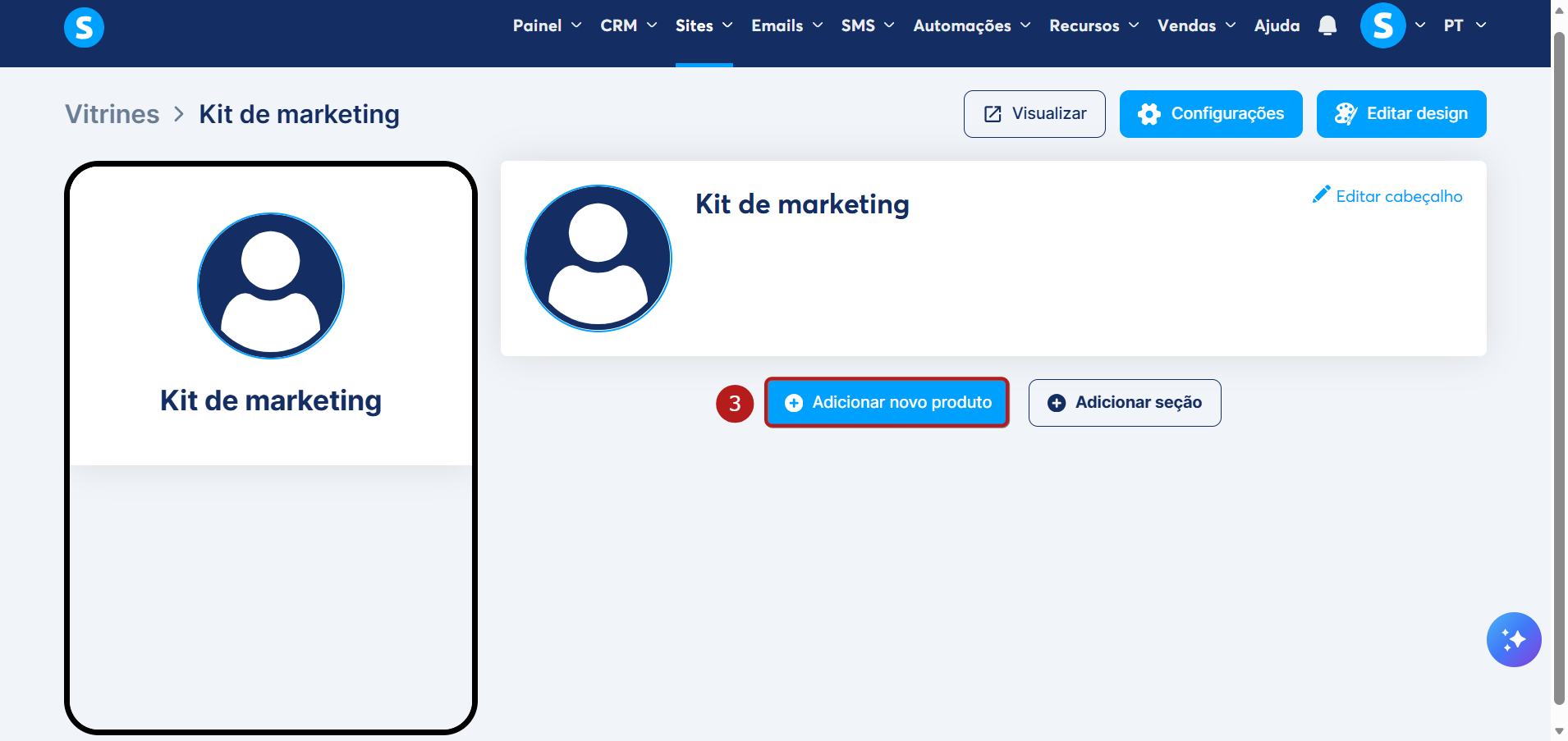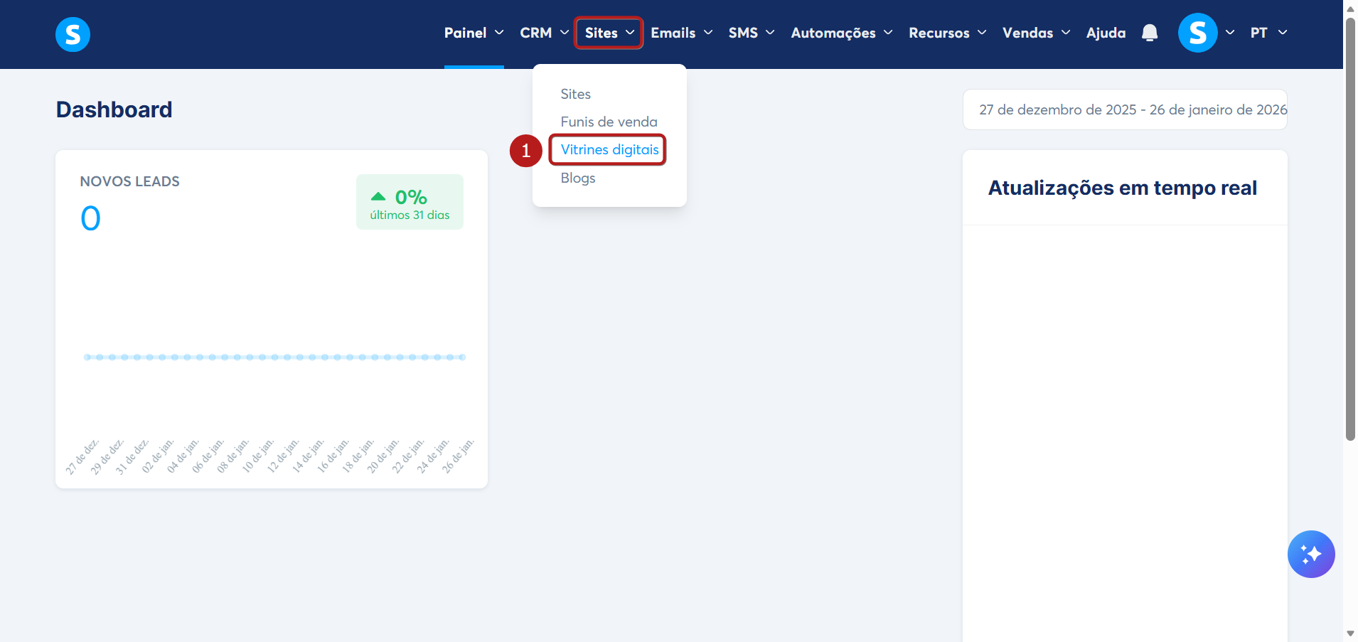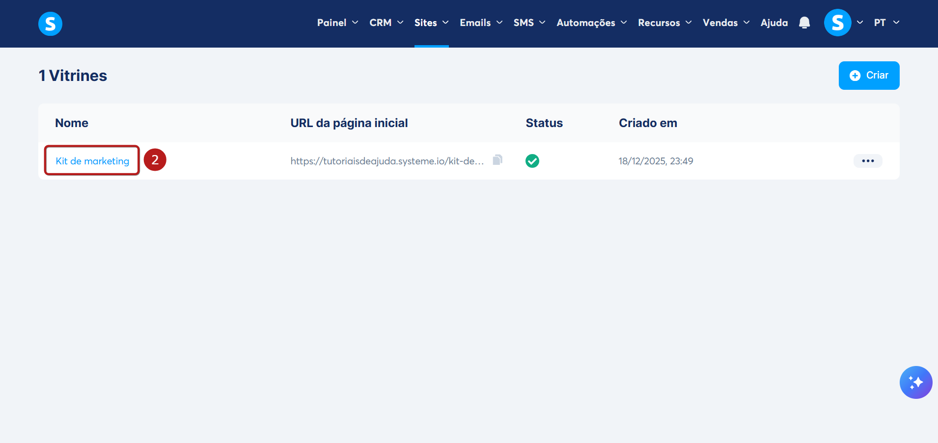 Vá até a aba Sites e clique em Vitrines digitais (1).