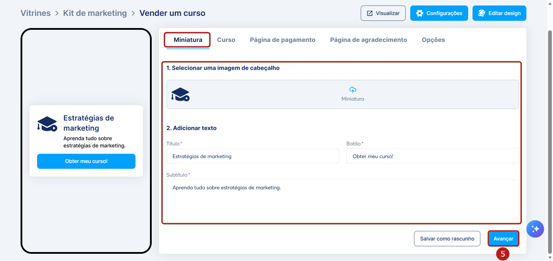 Na aba Miniatura, personalize a imagem do cabeçalho, o título, o texto do botão e o subtítulo.
