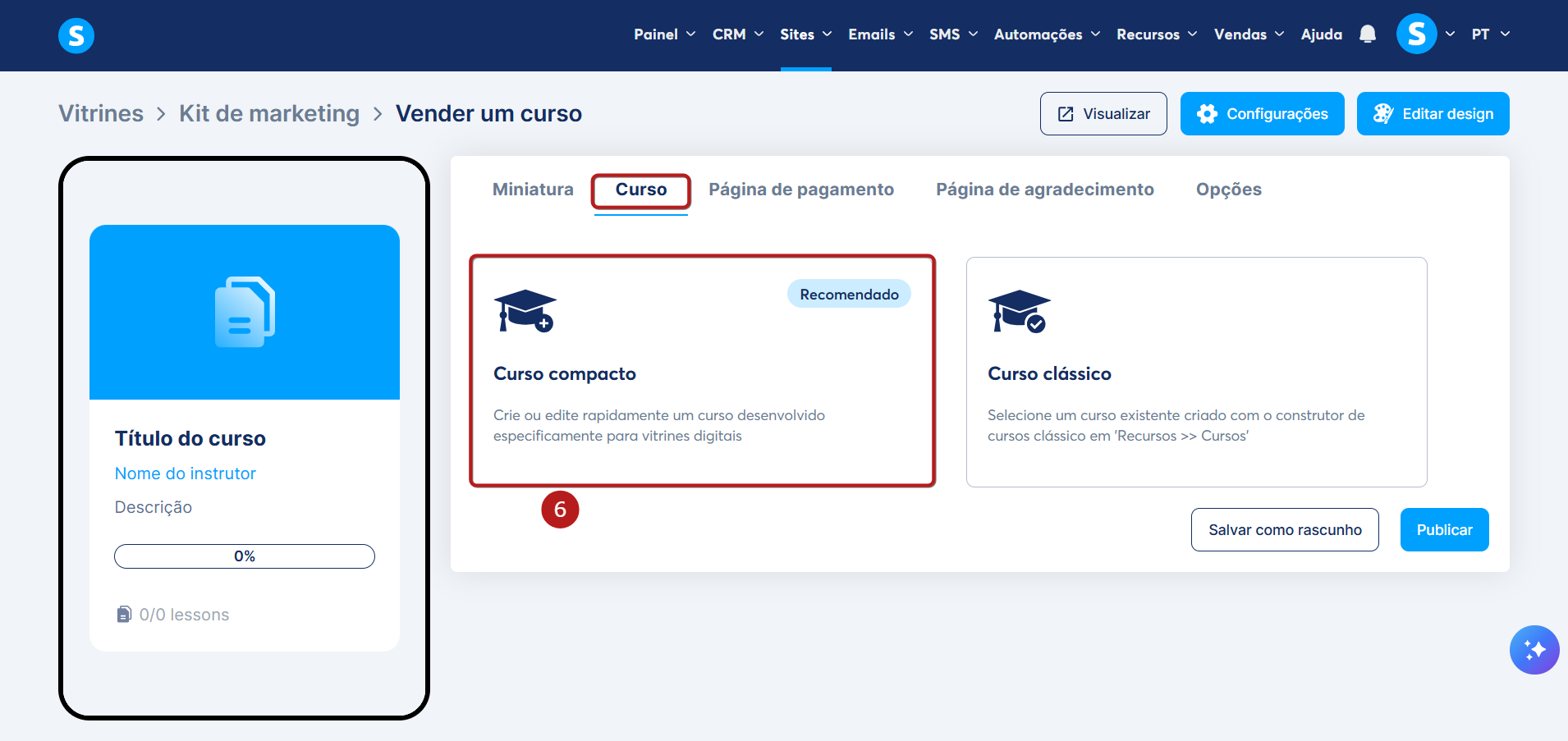 A systeme.io oferecer dois formatos de curso: Clássico e Compacto. Cada um é projetado para um estilo específico de criação do curso e de ensino.