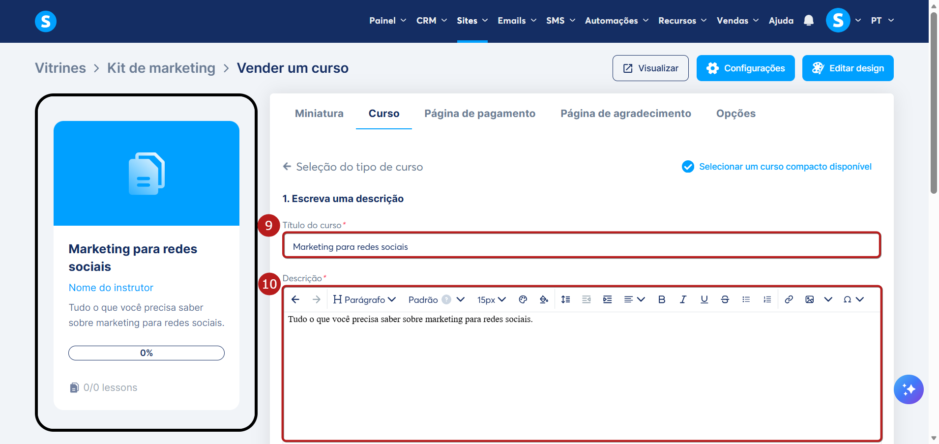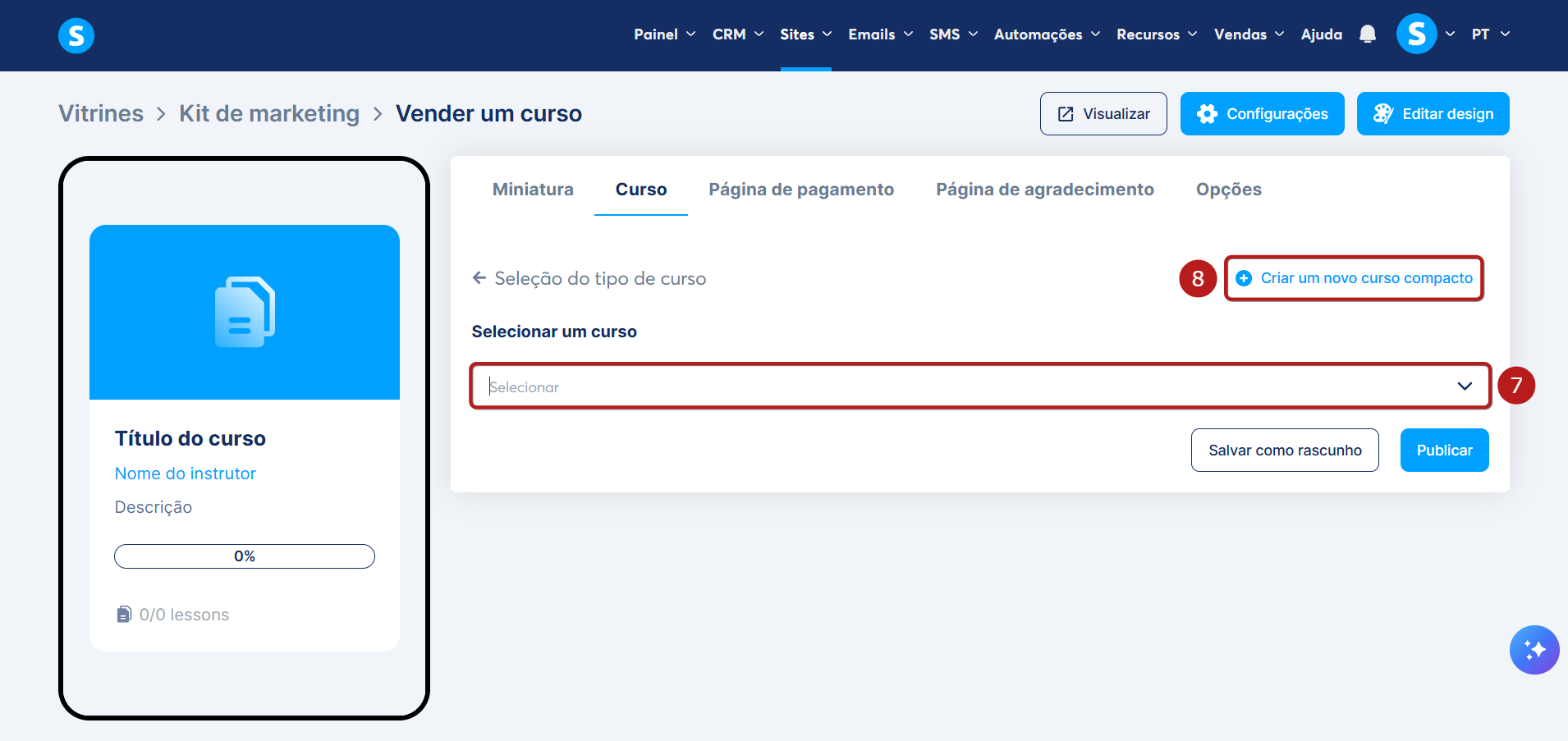 Observação: cursos compactos podem ser criados somente através da opção Vender um curso.