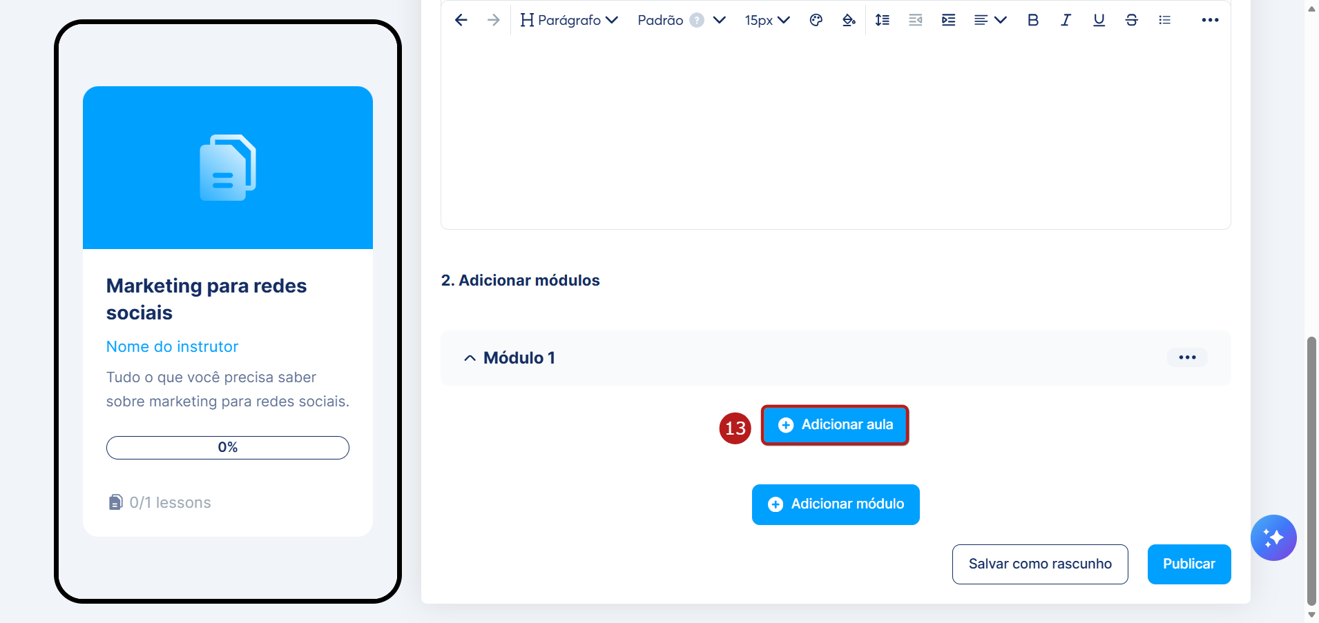 Clique em Adicionar aula (13) para adicionar conteúdo ao módulo.