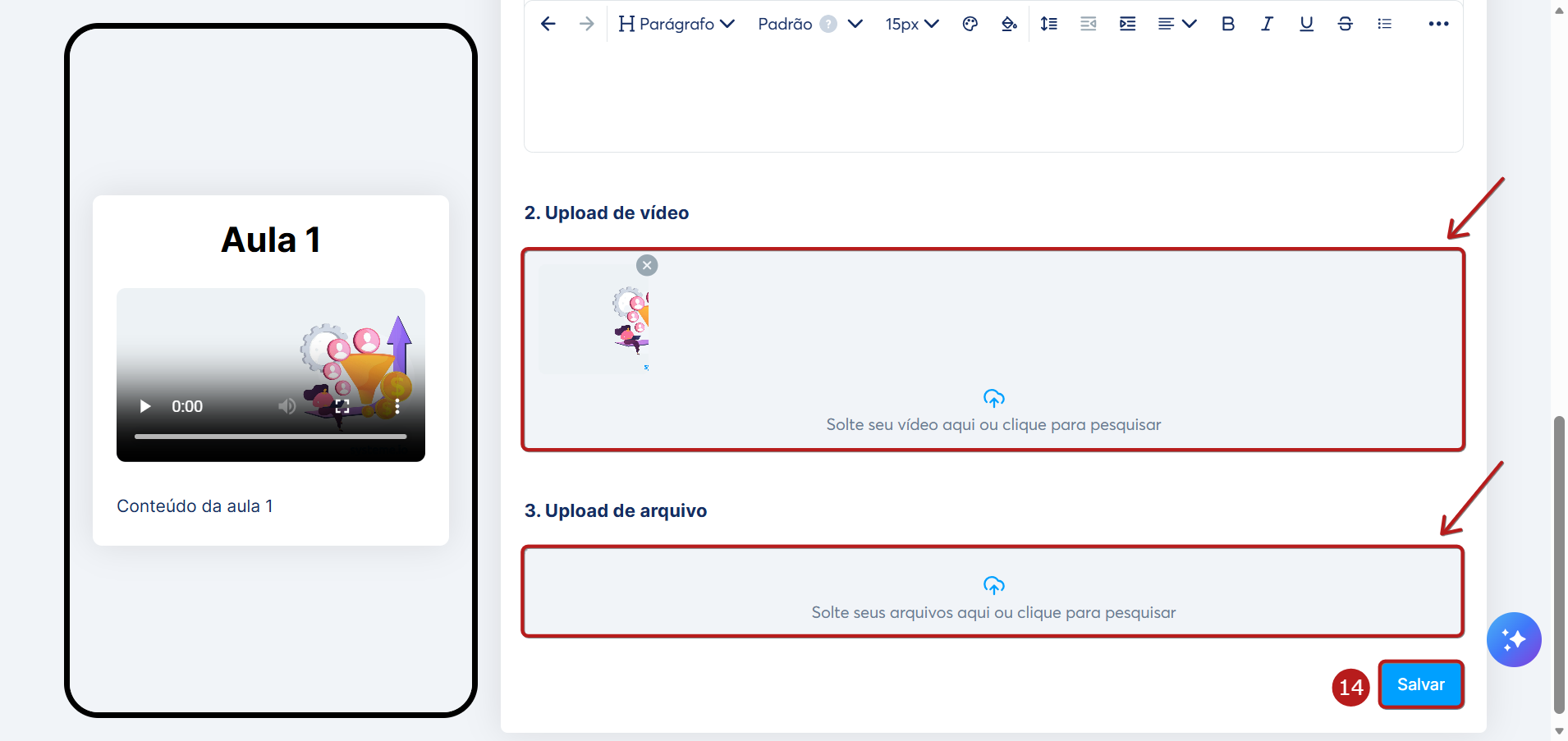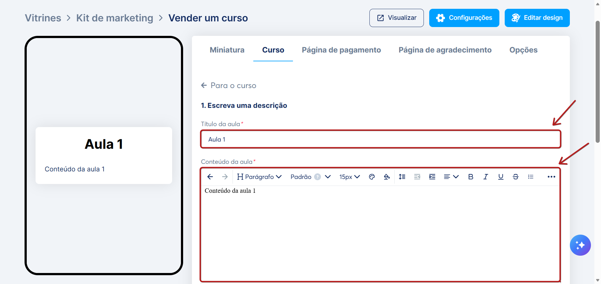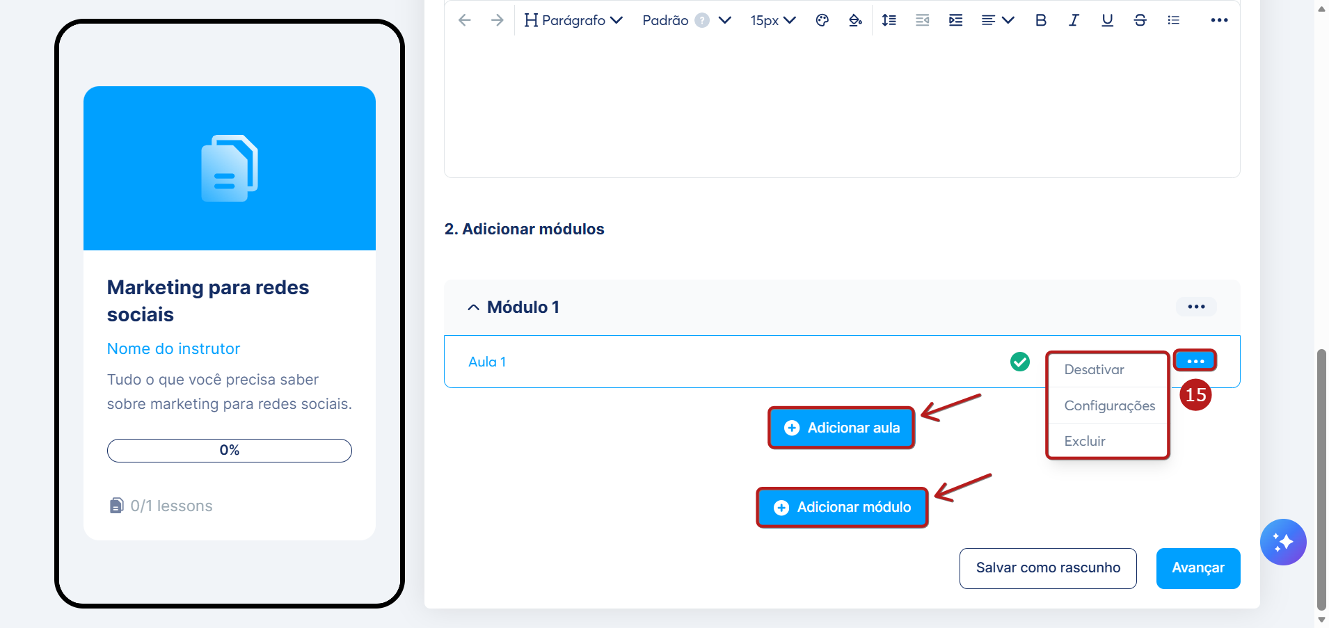 Sua primeira aula está pronta! Para editar um módulo ou aula, clique no menu de 3 pontos (15).
