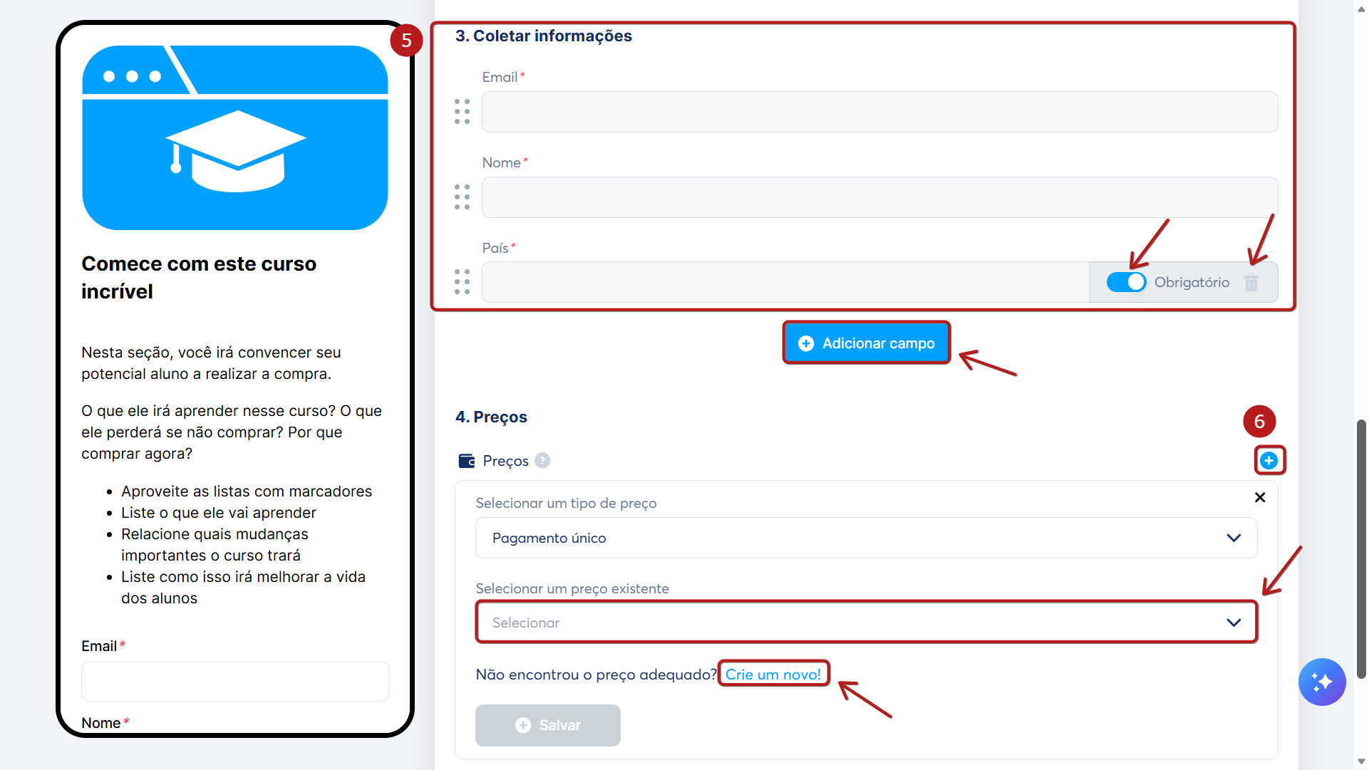 Em Coletar informações, selecione quais dados você deseja solicitar ao cliente no checkout (5).