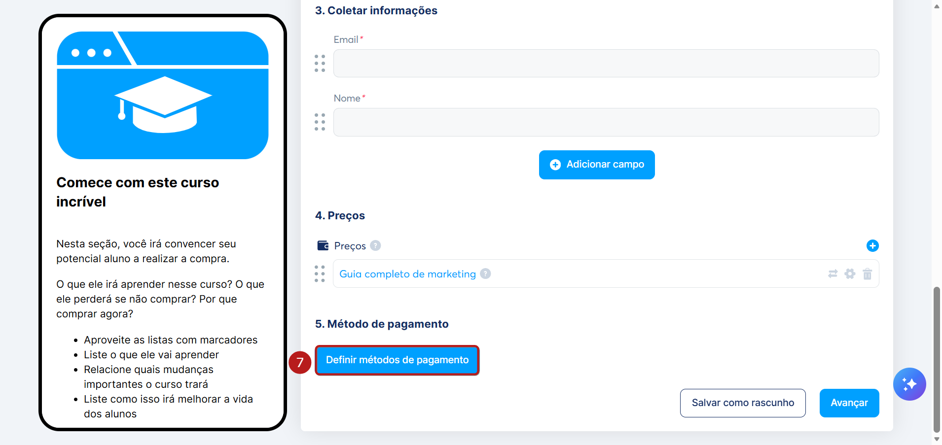 Clique em Definir métodos de pagamento (7) para configurar a moeda e os gateways de pagamento.
