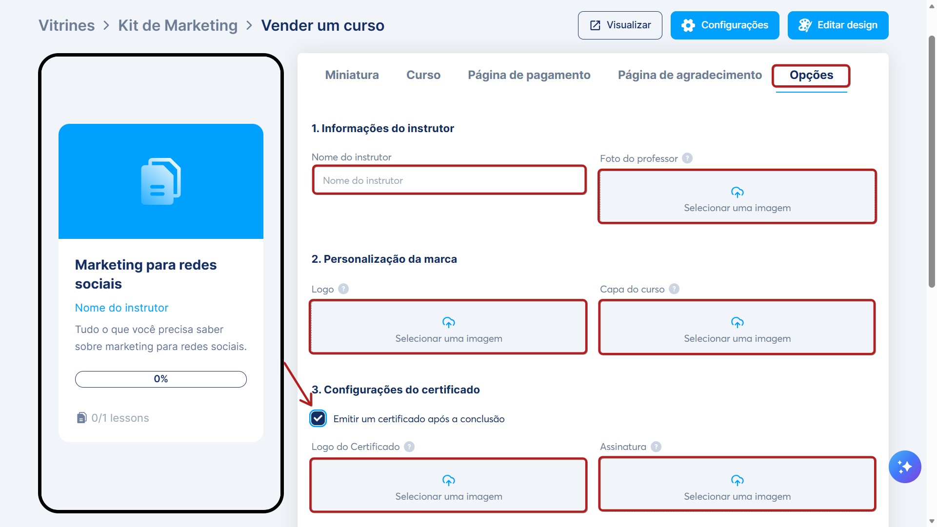 Por fim, use a aba Opções para personalizar o perfil do instrutor, a marca (logo e capa) e as configurações de certificado.