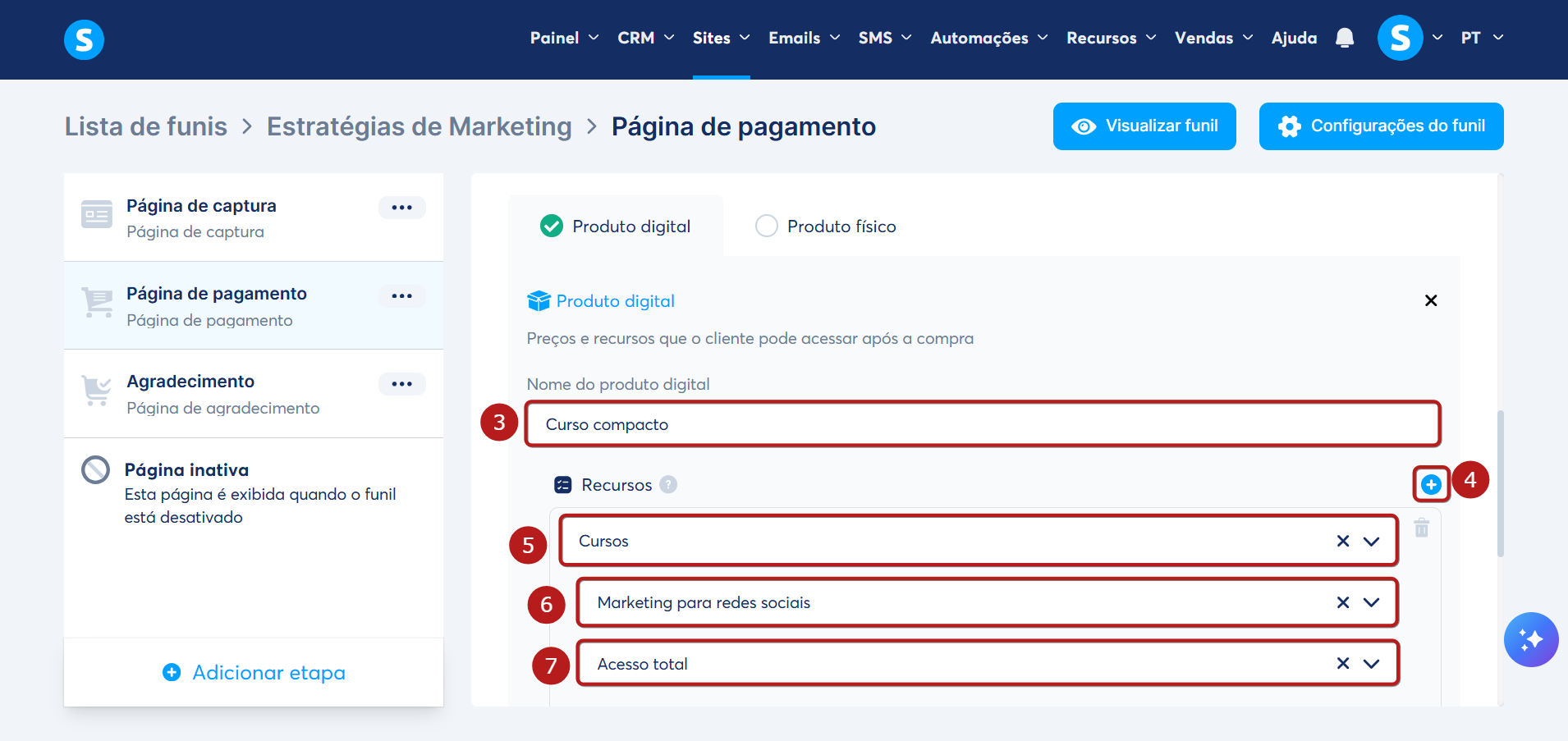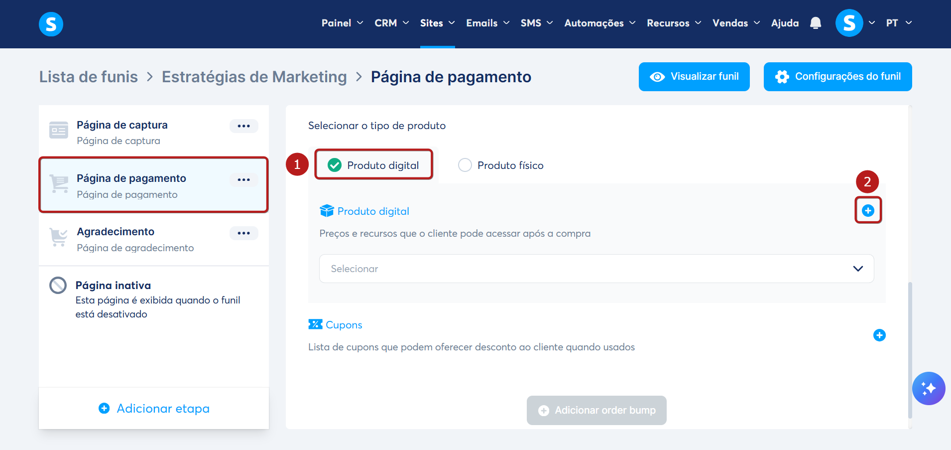 Na etapa da página de pagamento, selecione Produto digital (1) e clique no botão mais (+) (2).