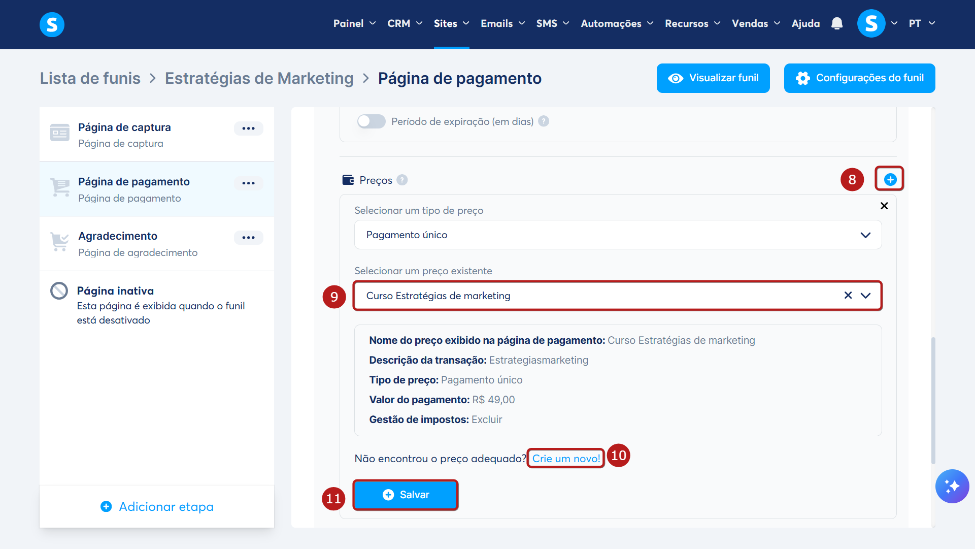 Clique no botão mais (+) (8). Selecione um preço existente (9) ou clique em Crie um novo (10).